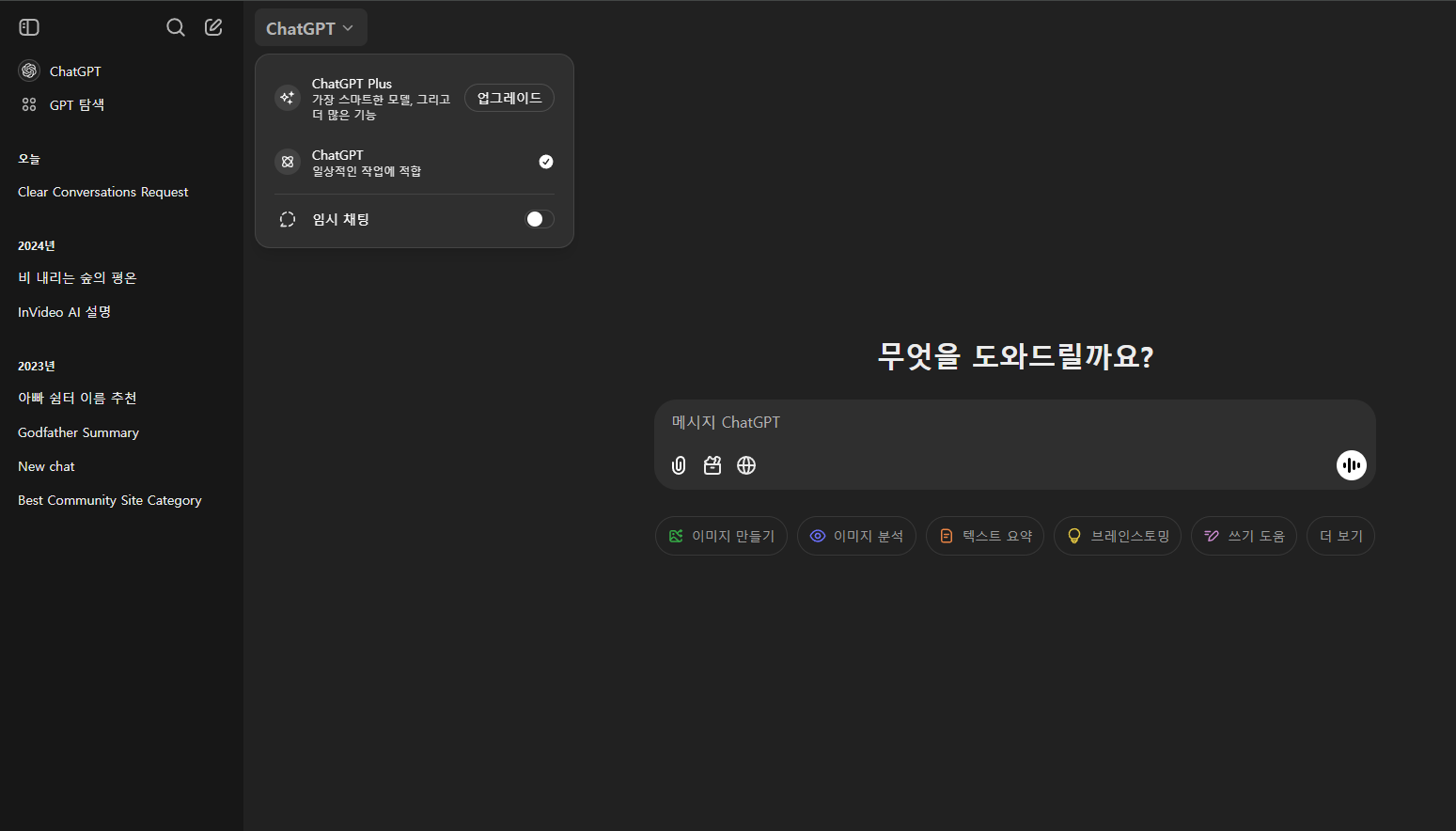 우선 로그인 후 다음과 같은 쳇지피티 화면이 나오고요. 여기서 질문을 하면 됩니다. 다만 업그레이드를 하려면